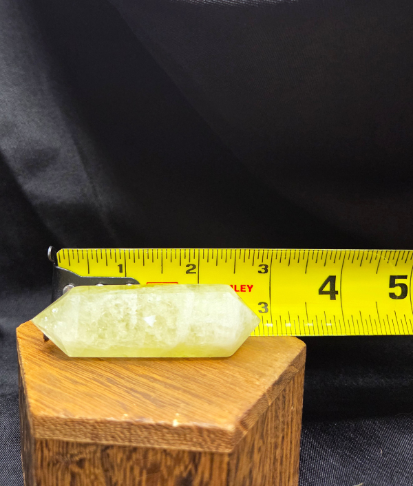 This lemon quartz double terminated point features a bright, transparent to semi-transparent yellow hue with soft golden undertones and excellent internal clarity. The coloration is fresh and luminous, ranging from pale lemon to warm honey tones, with natural internal veils that catch the light beautifully. The polished surface enhances the crystal’s natural brilliance, giving it a clean, vibrant appearance that is often mistaken for natural citrine.