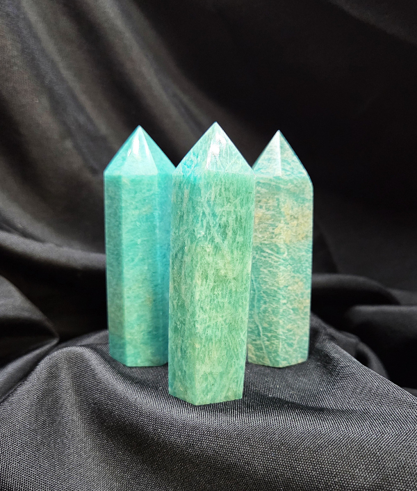 Amazonite is sourced from regions including Brazil, Madagascar, and parts of Africa, where rich color saturation and natural banding occur. Each point displays unique variations in tone, translucency, and patterning, making every piece one of a kind.