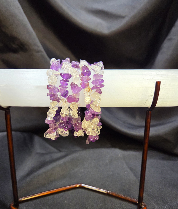 This bracelet features polished 5-7mm Amethyst and Clear Quartz chip beads strung on a durable, stretchable cord, comfortably fitting most wrist sizes. The complementary colors make it ideal for wearing alone or layering with other gemstone bracelets.