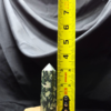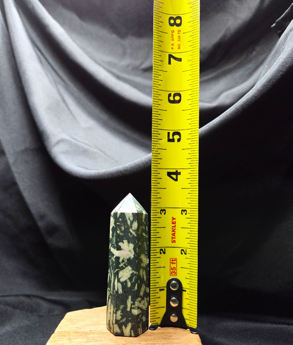 This bamboo jasper point features a deep forest-green to nearly black base accented by pale sage, cream, and soft olive inclusions that resemble scattered bamboo leaves or natural brushstrokes. The contrast between the dark matrix and lighter mineral fragments creates a bold, organic pattern that feels earthy and grounded. The smooth polish enhances the stone’s natural texture while preserving its raw, volcanic character, giving this piece a striking yet balanced appearance.