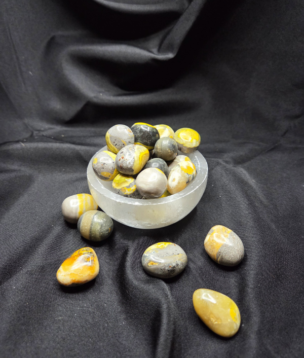 Bumblebee Jasper is a striking, high-contrast stone known for its vibrant bands of yellow, orange, black, and gray. Despite its name, it is not a true jasper but a combination of volcanic minerals, giving it a bold, energetic appearance. These Bumblebee Jasper tumble stones are polished to a smooth finish and are often used for motivation work, personal empowerment, and energy-focused practices.