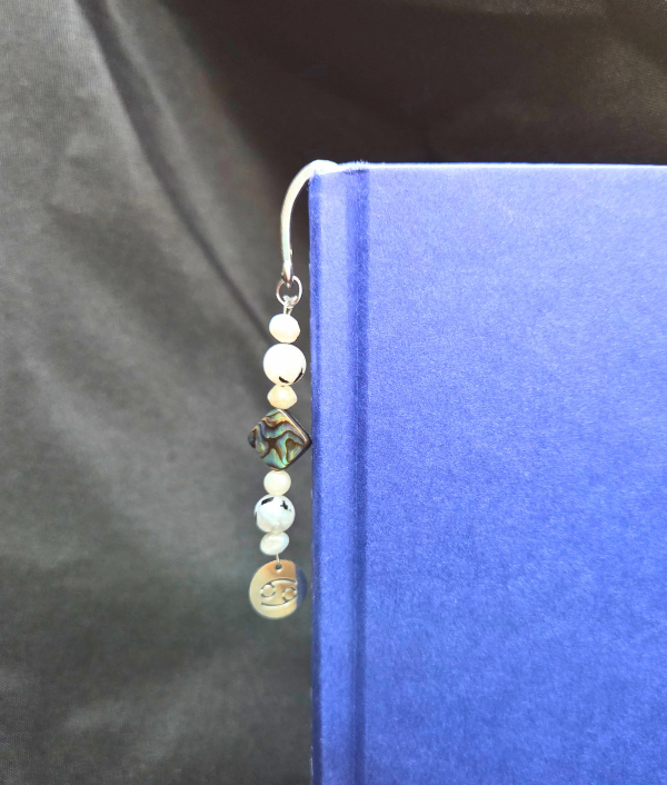 Celebrate the intuitive and nurturing energy of Cancer with this handmade Cancer gemstone bookmark, a meaningful and elegant accessory for readers, astrology lovers, and crystal collectors. This beautiful zodiac bookmark features a metal Cancer charm accented with Pearl, Rainbow Moonstone, and Abalone beads, all thoughtfully selected for their energetic alignment with the Cancer zodiac sign.