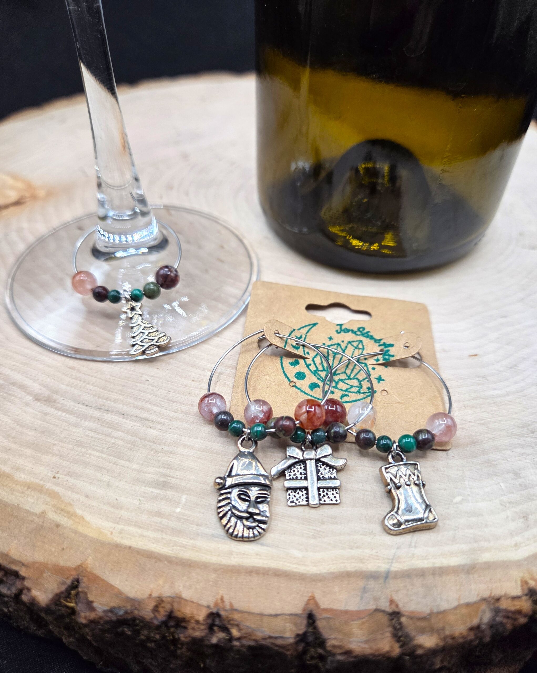 Celebrate the season in style with these Christmas Wine Charms, featuring festive metal holiday-themed charms paired with rich Red Fire Quartz, earthy Dragon Blood Jasper, and vibrant Malachite beads. Each charm is handcrafted to help guests keep track of their glasses while adding a warm, seasonal touch to any gathering.