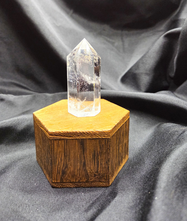 This clear quartz point features a transparent to milky white body with natural internal veils, fractures, and light-catching inclusions that give the stone depth and character. The polished surface enhances quartz’s natural clarity while preserving its organic internal structure. Clear quartz is a silicon dioxide mineral widely known for its versatility, durability, and widespread natural formation.