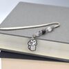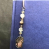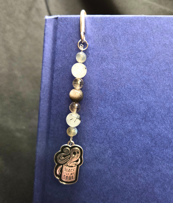 This bookmark features a metal coffee mug charm that is inscribed with “Black Like My Soul” and is highlighted with Labradorite, Smoky Quartz, Black Tourmalinated Quartz, and Rainbow Obsidian beads. Approximately 4.5″