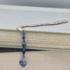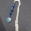 This book mark features an Abalone heart charm and is highlighted with Chrysocolla, Blue Apatite, Lapis Lazuli and blue crystal beads on a silver colored dolphin bookmark. Approximately 4.5”