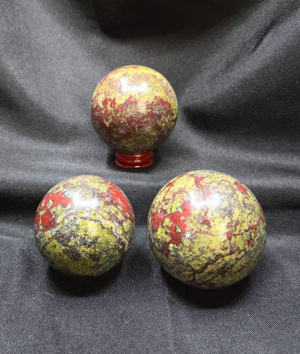 These Dragon Blood Jasper spheres showcase deep forest green tones dramatically contrasted with rich brick-red to crimson inclusions. The bold color contrast creates a striking, earthy pattern reminiscent of ancient landscapes. The polished finish enhances the natural marbling and movement within the stone, making each sphere completely one of a kind. The combination of grounding green and vibrant red gives this material its powerful and distinctive appearance.