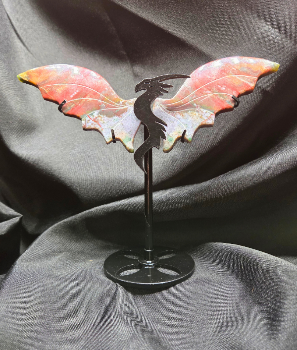 This striking ocean jasper dragon wing set features rich earthy tones of deep red, forest green, burnt orange, mustard, and soft cream flowing together in bold, organic patterns. Unlike traditional orbicular ocean jasper, this variety showcases sweeping color movement and layered mineral transitions that create a warm, grounding presence. The polished carving highlights the stone’s natural depth and dynamic color contrast, making each set completely one of a kind with its own unique landscape-like design.