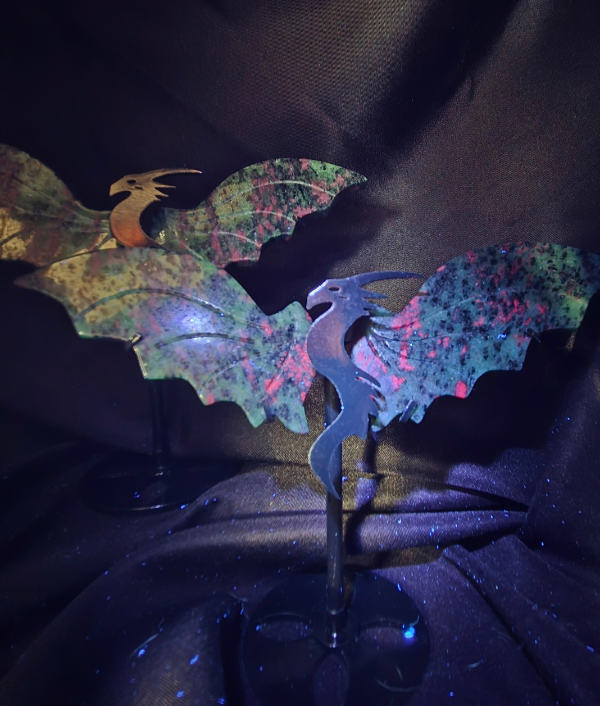This ruby in zoisite dragon wing set showcases a striking natural combination of deep green zoisite matrix stone with vibrant red ruby inclusions. The contrasting red and green mineral patterning creates a bold, dramatic visual effect that is highly valued in decorative crystal carvings. The polished surface enhances the natural color depth and organic distribution of ruby crystals within the zoisite base. Since this material forms naturally, each wing set is completely unique.