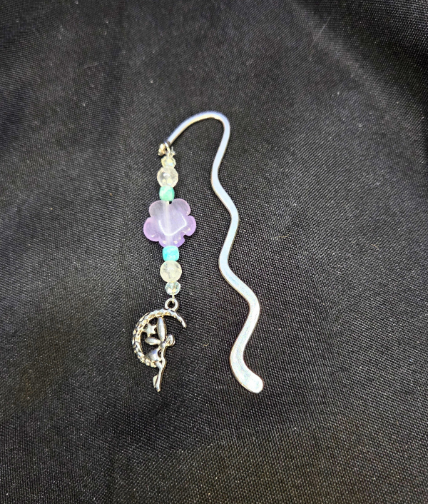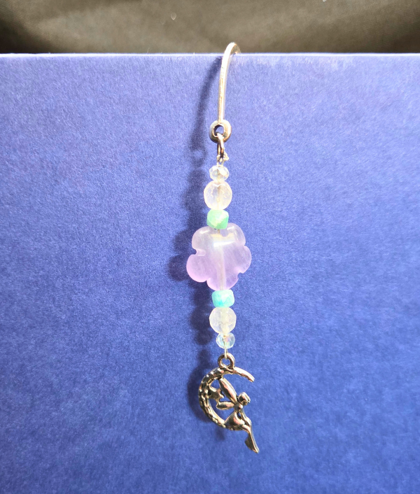 Add a touch of enchantment to your reading routine with this handmade fairy gemstone bookmark, a whimsical and elegant accessory for book lovers, fantasy fans, and crystal collectors. This beautiful crystal bookmark features a delicate metal fairy charm accented with Fluorite, Amazonite, Rose Quartz, and clear crystal beads, all arranged on a stylish silver zig zag bookmark base for a magical and eye-catching design.