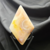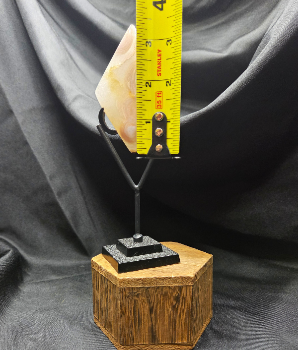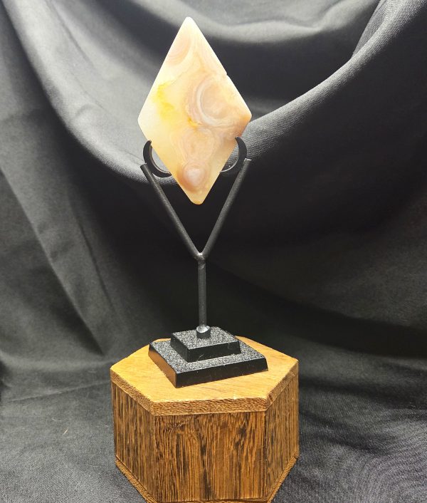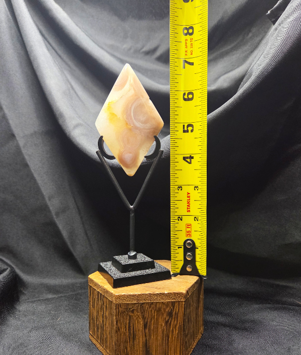 This stunning Flower Agate diamond features soft peach, cream, and blush tones with beautiful plume-like formations that resemble blooming flowers suspended within the stone. Each natural pattern is completely unique, making this piece a true one-of-a-kind display crystal.
