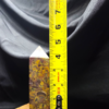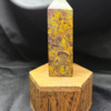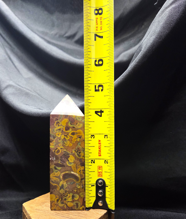This fruit jasper point displays a rich mosaic of mustard yellow, olive green, earthy brown, and muted plum tones, layered with organic orbicular patterns and natural mineral movement. The polish brings out the stone’s intricate textures and depth, highlighting fossil-like shapes and flowing inclusions that give the piece a grounded, earthy character. Each face reveals new details, making this point visually engaging from every angle.
