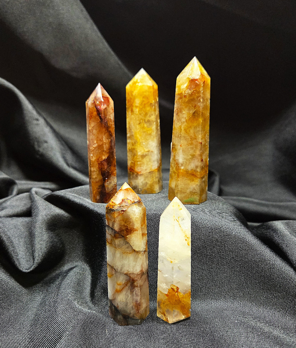 These radiant golden healer crystal points feature warm honey, amber, and soft golden tones flowing through clear to milky quartz, created by natural iron oxide inclusions. Subtle internal veils, wispy patterns, and glowing color gradients give each piece a luminous, sunlit appearance that feels both calming and energizing. The polished faces enhance the crystal’s natural brilliance while preserving its organic beauty, making every point truly one of a kind.