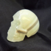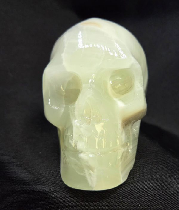 This is a polished crystal skull carving, measuring approximately 4 inches long, 3 inches tall, and 2.75 inches wide. Crystal skulls are popular among collectors, spiritual practitioners, and those drawn to symbolic carvings, as they are often associated with wisdom, insight, and ancient knowledge. This medium-sized skull has a substantial feel and displays beautifully on an altar, shelf, desk, or in a curated crystal collection. Its detailed carving and naturally layered banding make it an eye-catching display piece as well as a meaningful addition to meditation or energy work practices.