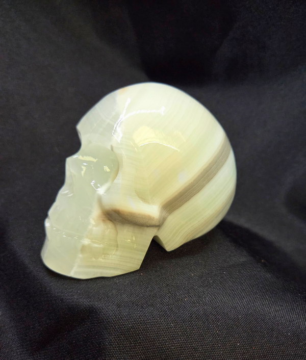 Banded Calcite is often associated with grounding, emotional balance, clarity, and gentle energetic cleansing. It is commonly used to help clear stagnant energy, support inner stability, and encourage a calm, centered mindset. Many crystal enthusiasts choose Banded Calcite for meditation, spiritual reflection, and practices focused on releasing stress while strengthening focus and personal growth. In a crystal skull form, Banded Calcite is often believed to enhance intuition, support wisdom, and encourage deeper connection to higher guidance while also bringing a steady, nurturing energy into the space.