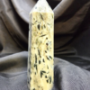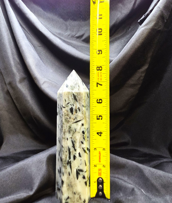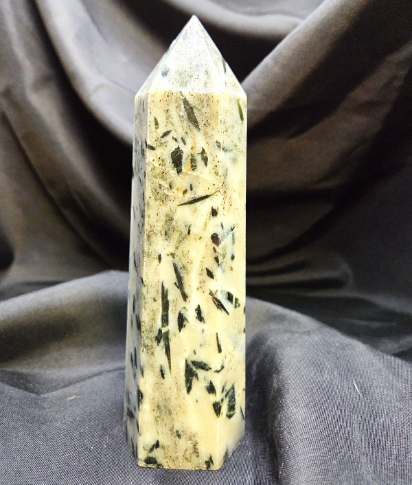 This stunning Green Tourmaline tower showcases naturally occurring tourmaline inclusions suspended within a lighter stone matrix, creating a striking contrast of earthy greens, creams, and organic patterns. Each angle reveals unique textures and depth, making this piece a one-of-a-kind addition to any crystal collection.