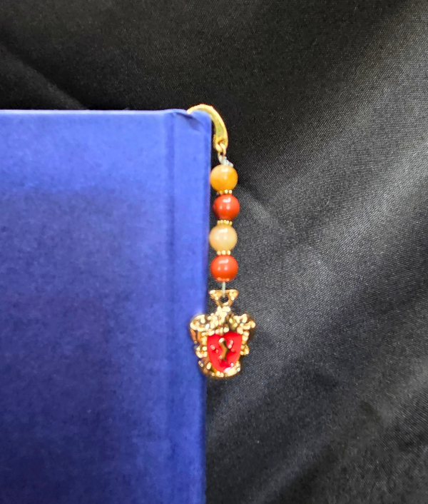 This bookmark feature an enamel Gryffindor charm highlighted with Red Jasper, Yellow Jade, and Gold Spacer beads. Approximately 3″