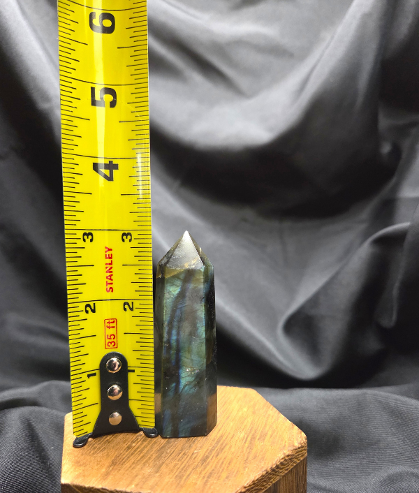 This piece is a polished crystal point with a single pointed termination, measuring approximately 3 inches tall. Crystal points are often used to focus, direct, and amplify energy through the pointed tip. The upright shape makes this labradorite point well suited for meditation spaces, crystal grids, altar arrangements, energy work, or decorative display. Its balanced size allows it to stand comfortably on its own while showcasing the stone’s natural flash.