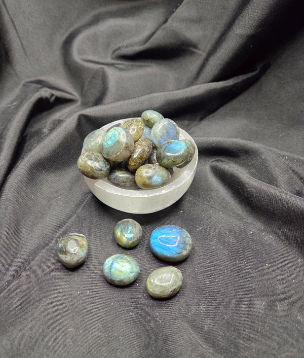 These Labradorite tumble stones shimmer with mesmerizing flashes of blue, green, and gold—an effect known as labradorescence that makes each piece truly captivating. Polished smooth while retaining their natural character, every stone reveals its own unique play of light and pattern.