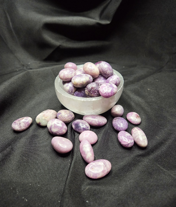 Lepidolite is a lithium-rich mica known for its soft lavender, lilac, and pale purple tones, often with subtle shimmer from its layered structure. These Lepidolite tumble stones have a smooth polish while still reflecting the stone’s natural mica texture. Lepidolite is commonly used for calming practices, meditation, and emotional balance work.