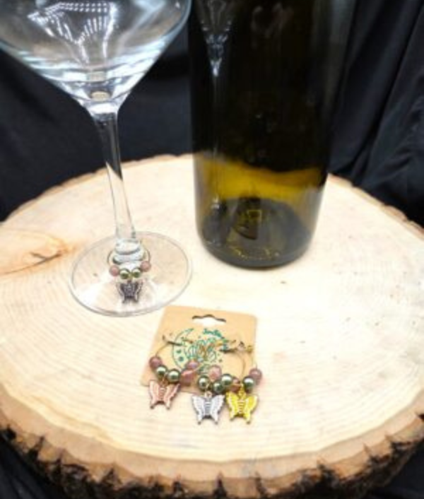 Bring whimsy and color to your gatherings with these Butterfly Wine Charms, featuring delicate butterflies in assorted metal finishes paired with soft Strawberry Quartz and shimmering Green Pearlized Glass beads. Each charm is handcrafted to help guests easily identify their glasses while adding a playful, elegant touch to any table setting.