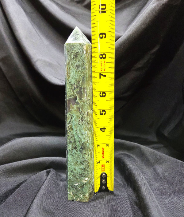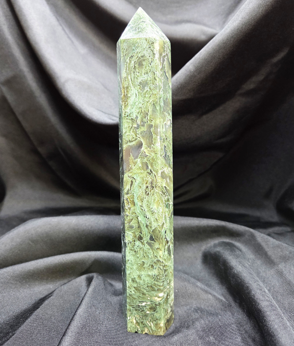 This moss agate tower features soft green, moss-like inclusions suspended within a translucent to milky chalcedony base. The natural patterns resemble foliage, vines, and forest growth, giving each tower a calm, earthy appearance. Moss agate is a variety of chalcedony known for its organic inclusions formed during the stone’s development.