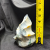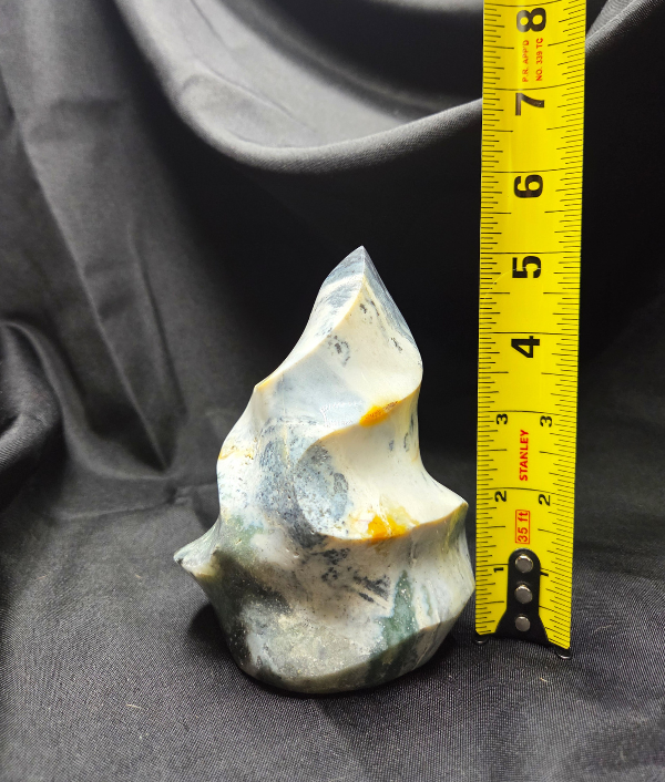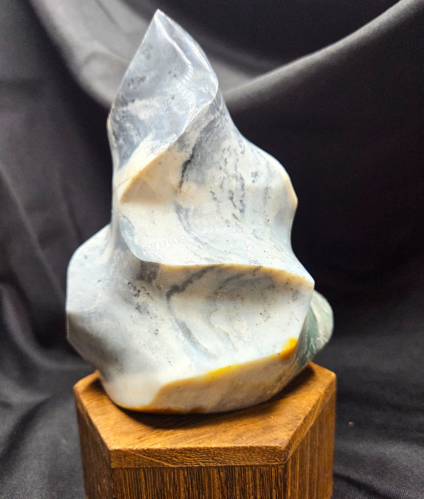 This stunning Ocean Jasper Flame features soft, flowing layers of cream, blue-gray, green, and warm golden tones, beautifully shaped into a dynamic flame carving. Polished to a smooth finish, this piece highlights the natural movement and depth Ocean Jasper is known for, making it a captivating display piece for any collection.
