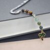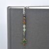 This bookmark features and enamel Palm Tree charm highlighted with Green Moss Agate, Serpentine, Green Aventurine, Prehnite, Traditional Tiger’s Eye, Brown Striped Agate, and Bronzite beads. Approximately 4.5″