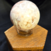 This pink amethyst sphere features soft blush, peach, and creamy champagne tones with gentle cloud-like formations and subtle crystalline textures throughout its polished surface. The delicate coloration gives this piece a soothing, romantic presence, while natural internal patterns add depth and visual intrigue. Its smooth, high-polish finish highlights the stone’s organic beauty, making it a calming yet eye-catching addition to any space.
