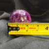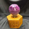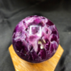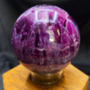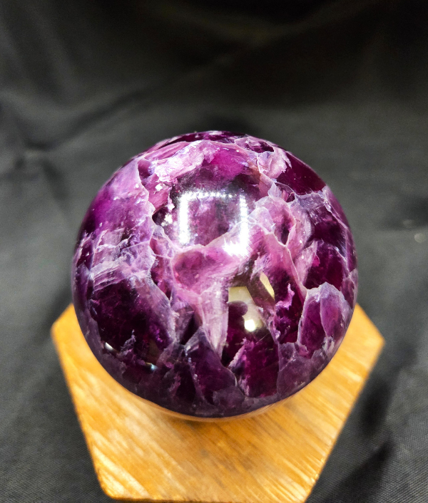 This purple fluorite sphere showcases rich violet and plum tones with translucent layers and natural internal fracturing that create depth and visual movement throughout the polished surface. Light passes through the stone beautifully, highlighting its crystalline structure and subtle zoning. The glossy finish enhances fluorite’s glassy luster, giving this sphere a striking yet calming presence.