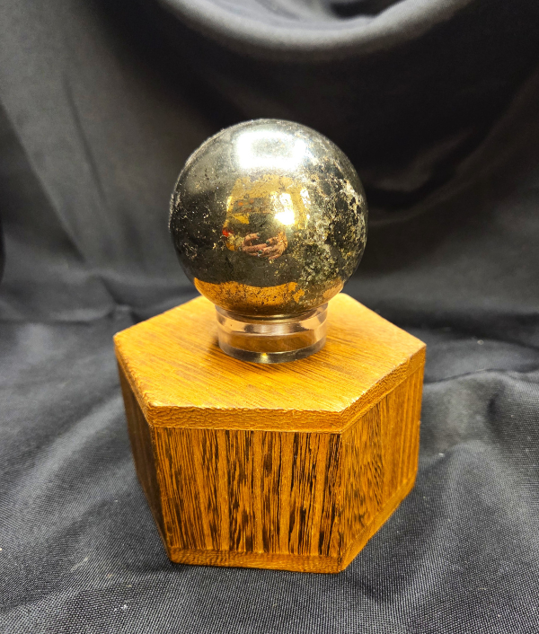 This pyrite sphere features a deep metallic luster with rich brassy-gold flashes that shimmer across its polished surface. Natural variations and darker mineral matrix create depth and character, giving the sphere a bold, grounding presence. Its reflective finish catches the light beautifully, making this piece both visually striking and energetically powerful.