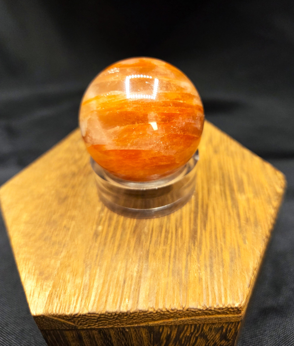 This red fire quartz sphere showcases vibrant bands of fiery red, orange, and warm amber tones, created by natural hematite inclusions suspended within clear to translucent quartz. The polished surface reveals dynamic internal movement, with glowing layers and wisps that appear to flicker as light passes through the stone. Its bold coloration and energetic visual depth give this sphere a powerful, captivating presence.