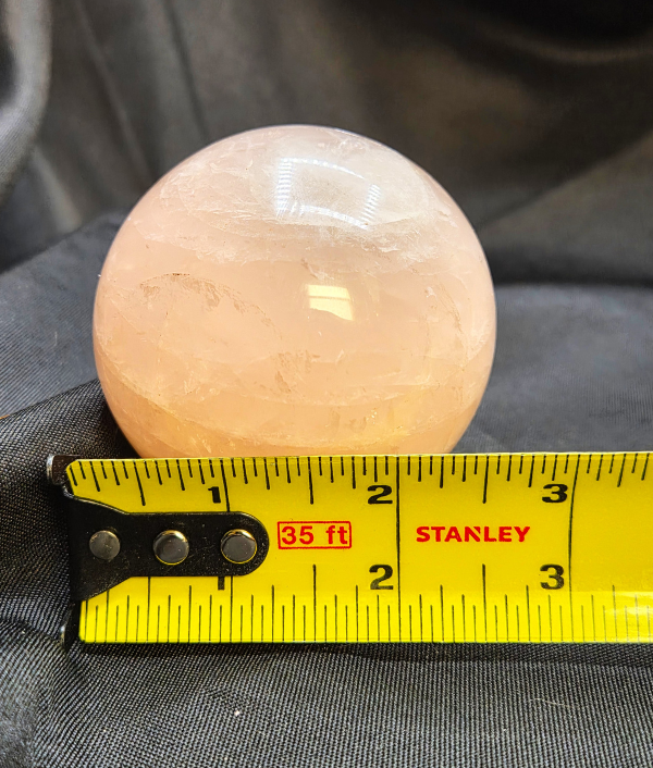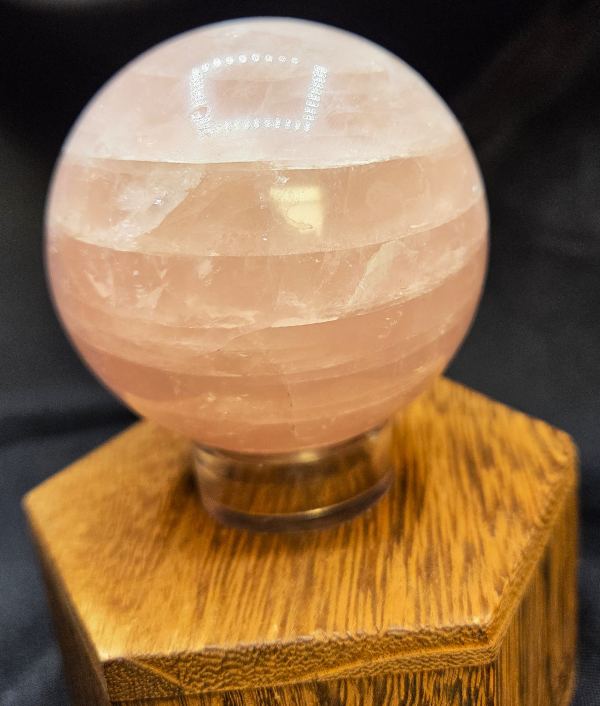 This rose quartz sphere features soft blush to pale pink tones with gentle clouding and natural internal veils that create a soothing, luminous appearance. The polished surface highlights subtle variations in color and translucency, giving the sphere a calm, nurturing presence. Its delicate coloration and smooth finish make it both visually comforting and energetically inviting.