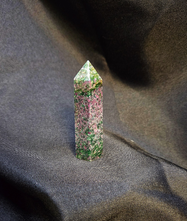This striking Ruby in Fuchsite point showcases vibrant ruby inclusions in shades of deep pink to rich red embedded within a soothing green fuchsite matrix. The natural contrast between the bold ruby and soft, shimmering green background creates a beautiful balance of intensity and calm. Subtle mica sparkle within the fuchsite adds gentle reflective shimmer, while the polished tower shape enhances the stone’s color variation and organic patterning. Each piece features unique ruby distribution and natural mineral textures, making every point one of a kind.