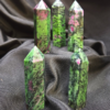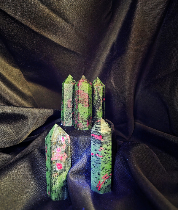 These ruby in zoisite points display a striking natural combination of deep red ruby inclusions set within rich green zoisite matrix stone. The contrast between the vibrant ruby flecks and earthy green background creates a unique, eye-catching appearance that makes each crystal point visually dynamic. Polished surfaces enhance the natural mineral patterns while maintaining the stone’s organic beauty. Because ruby in zoisite forms naturally, every point has its own distinct distribution of ruby crystals and green matrix, ensuring that no two pieces are exactly the same.