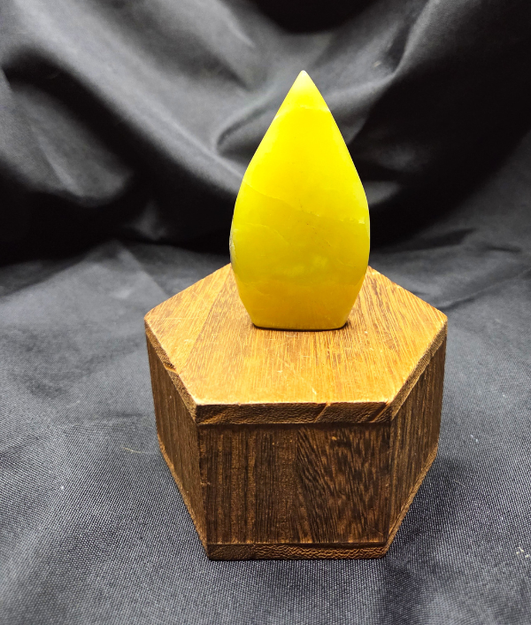 his serpentine waterdrop features smooth, vibrant yellow to yellow-green tones with subtle natural variations throughout the stone. The polished surface highlights serpentine’s soft translucency and waxy luster, giving the piece a warm, calming appearance. Serpentine is a group of magnesium-rich silicate minerals formed through the alteration of ultramafic rocks deep within the Earth.