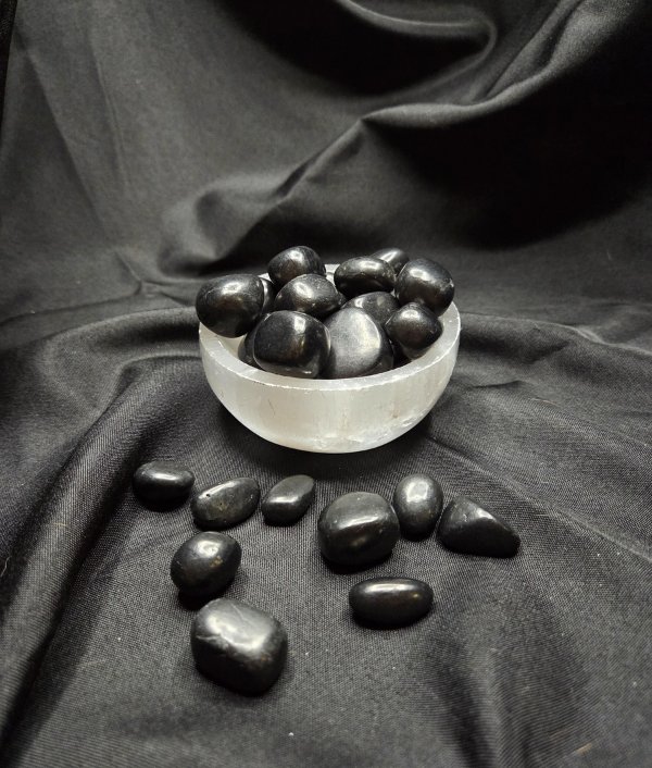 Shungite is a carbon-rich mineraloid known for its deep black color, matte to slightly glossy surface, and lightweight feel compared to most stones. Unlike crystalline minerals, shungite has an amorphous structure, giving it a more organic appearance. Tumbled shungite stones may show natural surface textures, small pits, or subtle variations in sheen.
