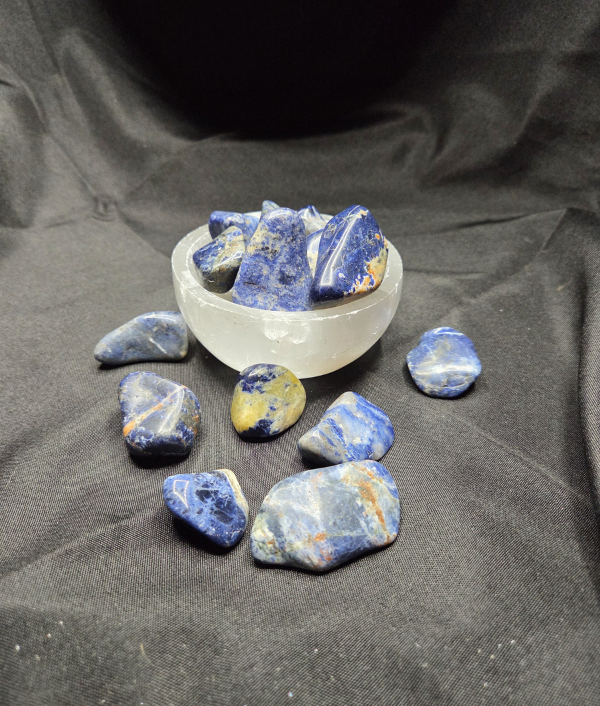 Each Sodalite tumble stone will be intuitively chosen for you. As these are natural stones, variations in blue intensity, veining, size, and shape are to be expected, making every piece unique.
