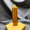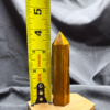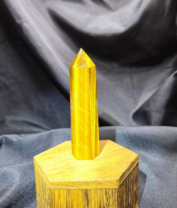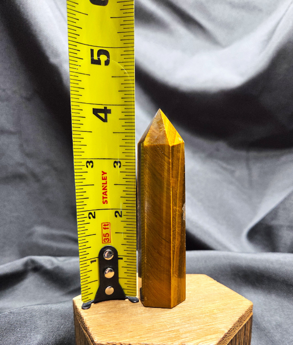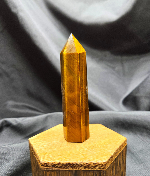 This Tiger’s Eye point displays rich golden browns, warm honey tones, and deep bronze bands that shimmer as the light moves across its surface. The stone’s signature chatoyancy—often described as a silky, cat’s-eye effect—creates flowing streaks of light that give the piece depth and movement. Each face reveals layered bands formed naturally within the stone, giving this point a bold yet grounding presence.