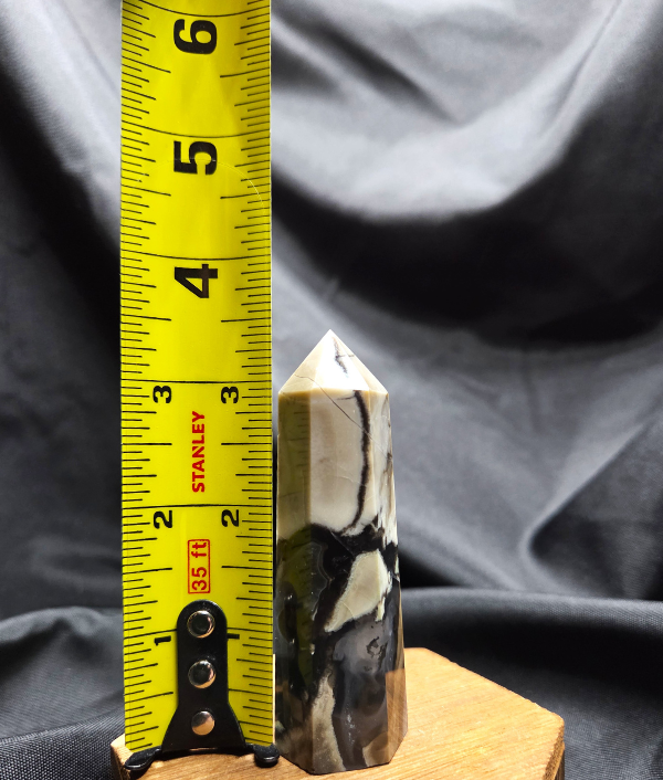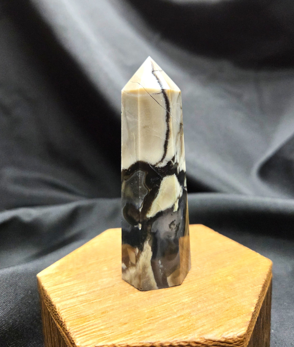 This piece is a polished crystal point with a single pointed termination, measuring approximately 3.5 inches tall. Crystal points are often used to focus, direct, and amplify energy through the pointed tip. The upright, elongated shape makes this volcano agate point well suited for statement display pieces, meditation spaces, crystal grids, altar arrangements, or energy work. Its size and visual impact allow it to stand securely on its own while drawing immediate attention.