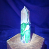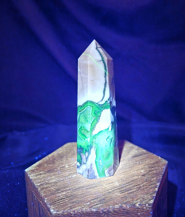 This volcano agate point features dramatic contrasts of creamy white, smoky gray, deep charcoal, and earthy brown, accented by striking internal banding and flowing mineral transitions. Under UV light, vivid green fluorescence appears along select seams and pockets, revealing hidden patterns not visible in normal lighting. The polish highlights both the stone’s layered structure and its raw, geological character, giving this piece a bold, high-contrast appearance that feels both organic and powerful.