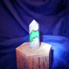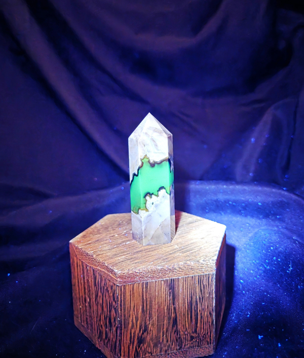 This volcano agate point features dramatic contrasts of creamy white, smoky gray, deep charcoal, and earthy brown, accented by striking internal banding and flowing mineral transitions. Under UV light, vivid green fluorescence appears along select seams and pockets, revealing hidden patterns not visible in normal lighting. The polish highlights both the stone’s layered structure and its raw, geological character, giving this piece a bold, high-contrast appearance that feels both organic and powerful.