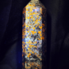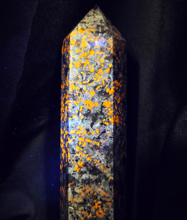 This yooperlite tower features a natural gray to charcoal base with scattered speckling and subtle mineral variation that appears understated in normal lighting. When exposed to UV light, the stone dramatically transforms, glowing with vivid neon orange and fiery amber patches caused by fluorescent sodalite inclusions. The contrast between its calm, stone-like daytime appearance and its intense UV fluorescence makes this piece especially striking and interactive. The polished surface enhances both the raw texture of the host rock and the brilliance of the glowing areas.