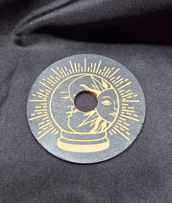 Display your favorite crystal sphere with this beautifully engraved wooden sphere holder featuring a mystical crystal ball with celestial sun and moon design. The detailed artwork symbolizes balance, intuition, and the connection between cosmic energies, making it a perfect addition to any spiritual or crystal display.